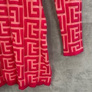 Stylish Balmain inspired dress featuring a textured knit with a vibrant red and hot pink pattern. Perfect for a bold look.