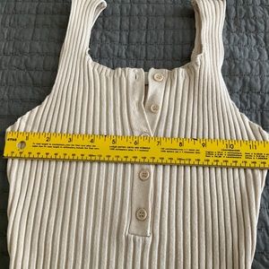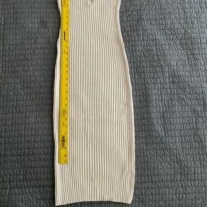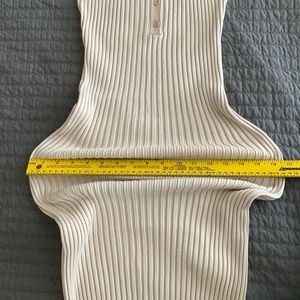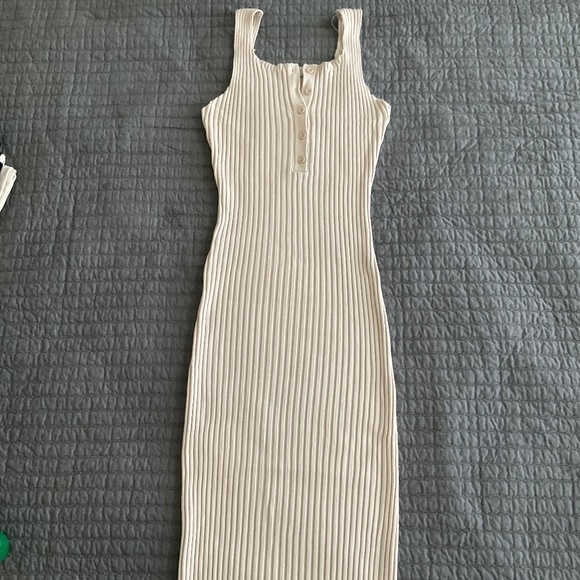 This knit dress is extremely stretchy ribbed knit fabric so it is very form fitting and flattering on many. There are 5 functional buttons at the front. The length is quite long on me at 5'2" but it will likely hit at mid-calf on someone around 5'6" and will definitely be below the knee for nearly anyone. I tried to show how much the dress can stretch in one of the photos, it really could fit a wide range of sizes. It is in excellent used condition with no signs of wear that I could find. It is a gorgeous cream color that is perfect for spring and summer. It is casual but also very chic and classy. I love it, but I'm not into form fitting attire anymore. Hope someone else can enjoy showing it off!