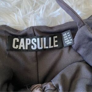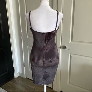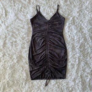 This spaghetti strapped gray mini dress features a flattering ruched design, perfect for any occasion. It can be adjusted in length at the bottom as well as on the straps. Very form fitting and flattering. Its sleek style and comfortable fit make it a must-have addition to your wardrobe.