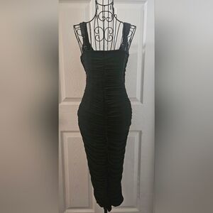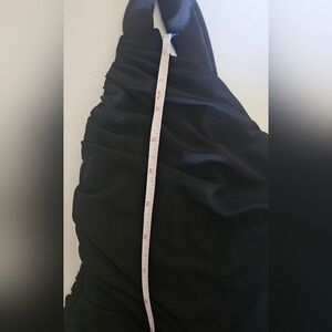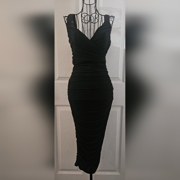 Romantic and sexy, form-fitting solid black pull-over pencil, over the knee cocktail dress. Fine mesh overlay. Adjustable straps and a plunging V neckline in a faux wrap-around front. Sturdy, smooth to the touch, all-way stretch fabric made from a polyester, viscose and elastane blend material. (check the measurements as the size tag is missing-according to the measurements this is about a size XS-XXS) See pics above for approximate cup measurements. Excellent condition🌻