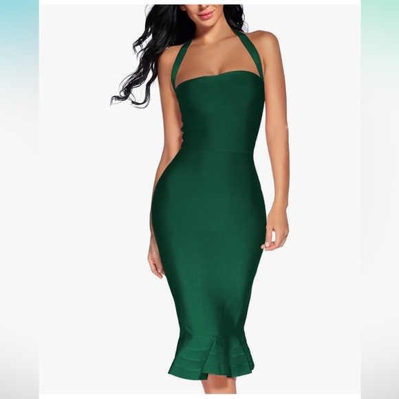 Dark green Bodycon ruffle dress with halter top and zipper. Worn once. Stretchy, knit material. Beautiful color and fit. Perfect for events or date night.