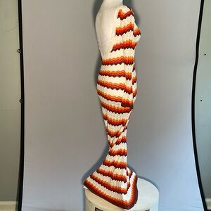 This Body-con form fitting, striped, long sleeve crocheted maxi dress, size small, with a deep scoop back is a head turner! Its vibrant stripes features a mix of red, orange, brown, and cream colors, perfect for Fall! It is soooo 70’s! It has no tags for fabric content or size, but it stretches to fit the body.