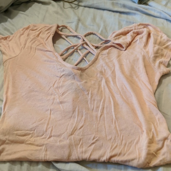 Light pink tight body suit with short sleeves. Criss cross both in front and back