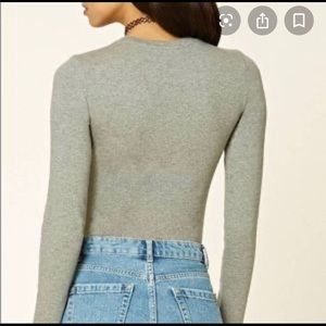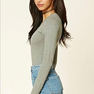 A bodysuit featuring a "Maybe Never" and heart graphic on front, long sleeves, a round neckline, and a snap-button closure.