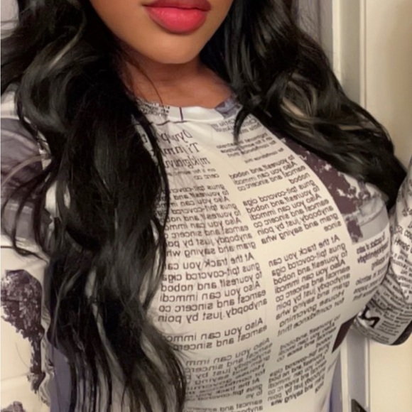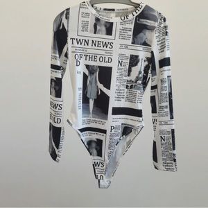 News paper bodysuit . Worn Once.. super stylish.. I paired with black denim distressed jeans and booties. Fits kinda loose