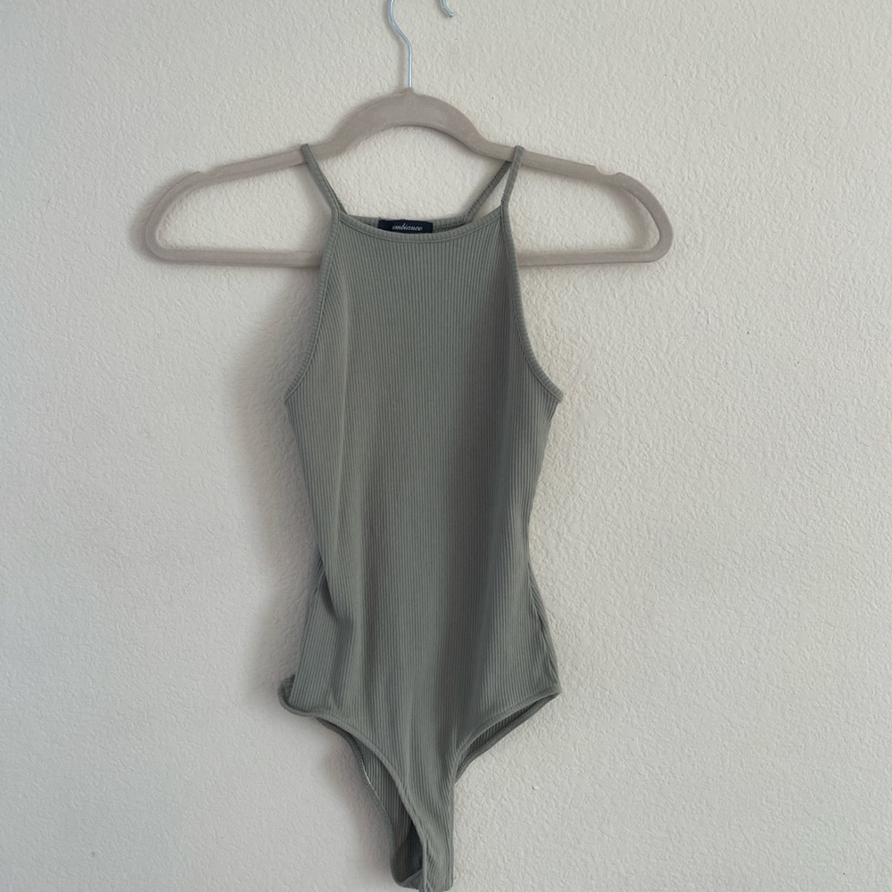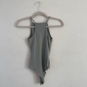 Only worn a few times, good condition. Bodysuit in a neutral sage green color. High neckline.