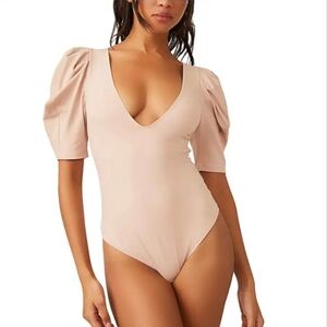 Deep V-Neck Short Ruched Puffed Sleeve Bodysuit!