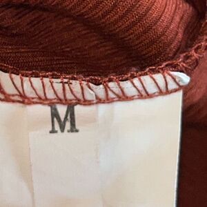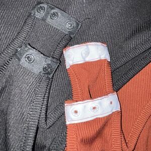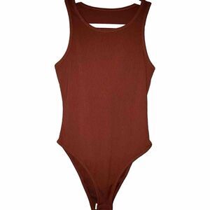 This product is a lot of two women's bodysuits in size M. The bodysuits are made of polyester and spandex and have a ribbed texture. They come in burnt orange and black colors and have a solid pattern. The bodysuits are tank tops with a wide strap and a round neckline. They are suitable for various occasions such as travel, party/cocktail, casual, and business. The bodysuits have a modern summer style and are themed as punk, grunge, bohemian, peasant, gothic, and fairy.