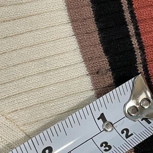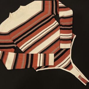 Hard to find "Say What?" brand striped knit thong bodysuit with mock turtleneck, snaps, long sleeves. Women's size XL. (Should fit 12-14-16, but see details and meaurements in photos to confirm your size.) Snaps work well. Flattering and smooth-fitting! Brown, rust, black and cream. Ribbed texture, with finer ribbed texture on mock neck. Lightweight sweater fabric: 80% rayon, 20% polyester. Nice stretch!
