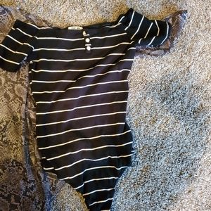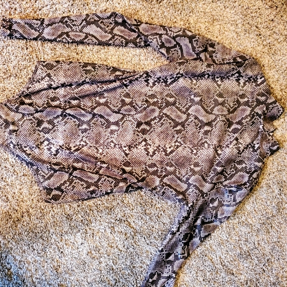 Fashion nova snakeskin bodysuit, striped is off the shoulder bodysuit and the snakeskin is sheer, and very sexy. I've never worn either. Perfect condition. True to size. Striped: shoulder to shoulder is 14 inches, armpit to crotch is 22 inches, very stretchy. Snakeskin shoulder to shoulder is 17, armpit to crotch is 24 inches. All measurments taken while garment is flat.