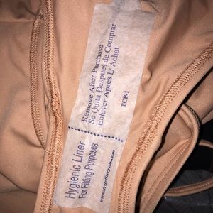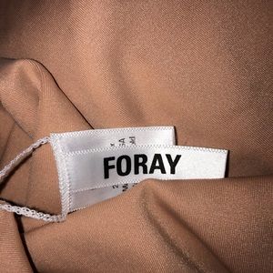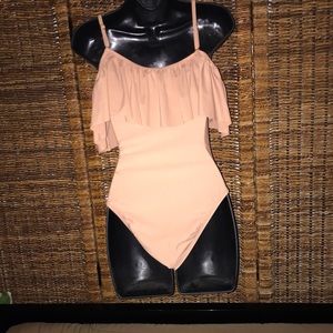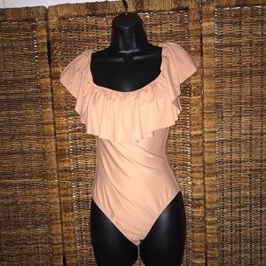 Bodysuit with Ruffle in flesh tone. One side removal strap to wear as one shoulder. NWOT but it does have panty protection intact. Cute to wear with jeans! No stains, rips or stretching. By Foray.