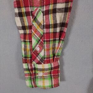 * Features: Soft cotton blend flannel, long sleeves with button cuffs, pocket, collared neckline, button up, plaid pattern in red, brown, green, yellow and cream