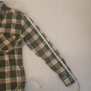 • Colors: Green, brown, tan, off-white, blue accents inside around collar, button holes, and sides (please see pictures)
