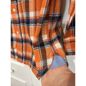 Bold color orange and blue plaid flannel. * classic spread collar and button-up closure