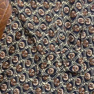 Experience luxury and style with Bogari Studio's Vintage AOP Casual Brown Tan Silk Button Front Shirt. Made with pre-owned silk, this shirt offers timeless quality and comfort. Its long-sleeved design and extra button included add convenience and versatility to your wardrobe. Choose size XL for an impeccable fit.