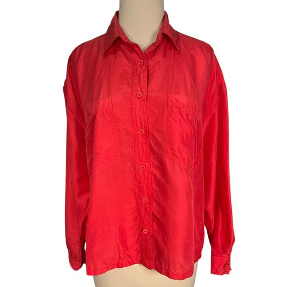 Bogari Vintage 100% Silk Button Up Shirt Pink Long Sleeve Pocket Blouse Size M