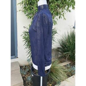 Bogdar Womens Designer Navy Blue Gold Metallic Long Sleeve Silk Top Xs. Condition is "Pre-owned". Shipped with USPS First Class. Length 22, bust 34, waist 34, hips 34. Measurements in inches. Perfect condition. No rips holes stains or fading. Smoke and pet free home. Fast shipping.