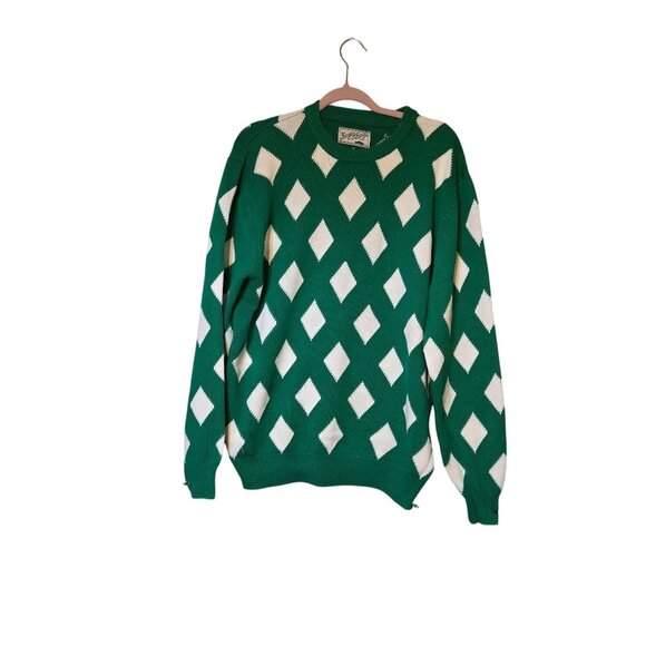 This eye-catching sweater tells a story of timeless style with its bold diamond pattern. Crafted in vibrant green and white hues, it offers a cozy fit for chilly days.