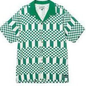 Green and slightly off-white button up shirt with a unique checkered pattern.