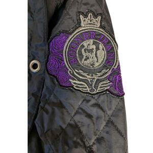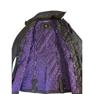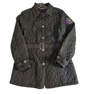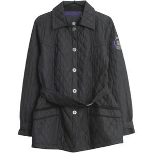 Stylish black quilted puffer jacket. Features button closure and belted waist. Perfect for cold weather.