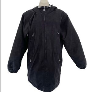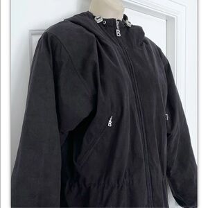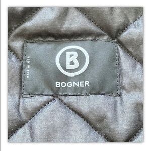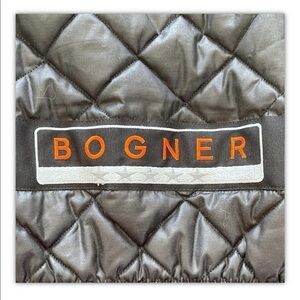 Bogner woman's black faux suede quilted interior jacket. Jacket has a full zip front, four zip front pockets, and a toggle cinch waist. It's made of 100% polyester and is a woman's size 6. Jacket is very well made. Made in USA.