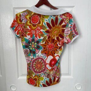 Bogner Women's Floral Golf Polo. Retro 70s Print. Whether to look stylish on the green or off, this beautiful polo is lightweight, breathable, and comfortable in anyway you move. Great maximalist look so you can stand out. Retails $219. In excellent condition with no rips, tears, or stains.