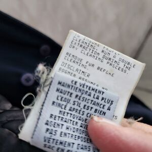 navy padded winter jacket. missing removable snap on hood. otherwise good condition. layer guard system