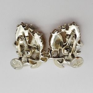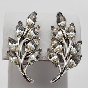 Bogoff Clear Rhinestone Leaf Earrings Screw Back Vintage 1960s SIlver Tone