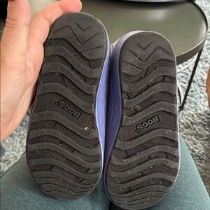 Vibrant purple boots with pink accents. Fun pattern design. Perfect for rain and snow. Wear is pictured.