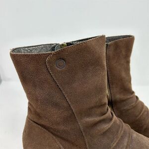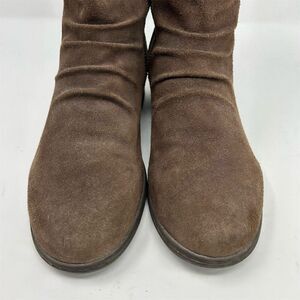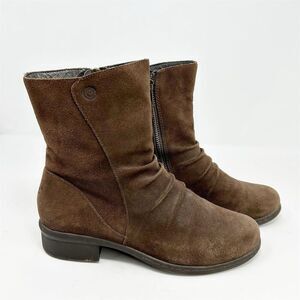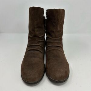 Keywords: women's mid-calf boots, brown leather boots, size 8 boots, waterproof winter boots, durable outsole boots, excellent traction boots, casual winter footwear, zip closure boots, synthetic lining boots, rubber outsole boots, pre-owned women's boots, winter fashion boots, leather mid-calf boots, women's casual boots, brown winter boots.