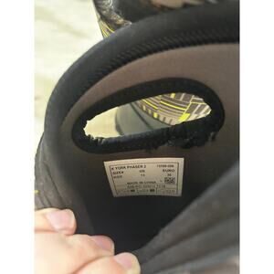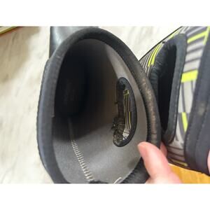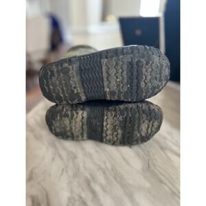 Very good condition, there is some dustiness on the sole but I have lightly wiped it down with a wipe. Tread is in great shape, lots of life left for your little one! Black with green and grey abstract print upper. Pull on rubber boot.