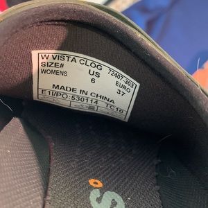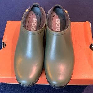 Bogs size 6 Vista waterproof clogs in olive green. New in box, although the box has a different size marked on it. They have a tiny bit of debris on the bottoms like they were tried on in a store, but these are very clean and have not been worn for real. See the photos for detail.