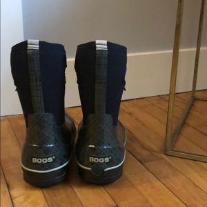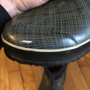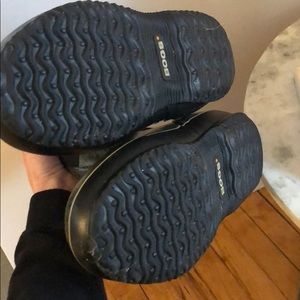 Great condition Bogs boots. Black with grey line detail. Two small flaws as shown in photos. Right heel, and scuff on left toe. Super warm and comfortable!