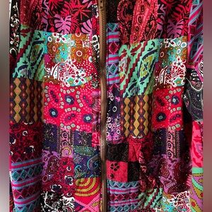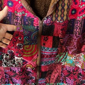 This is a statement piece!! Beautiful patchwork fabric in the outside in vibrant colors. Fully lined with warm brown feux-fur. Full zip. Pockets on the front. Used but excellent condition! No rips, stains or damage.