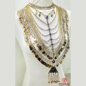 This Bohemian Afghan coin necklace has an oversized design with layered strands. Each strand is detailed with coins that create a bold look. It is made to stand out in style.