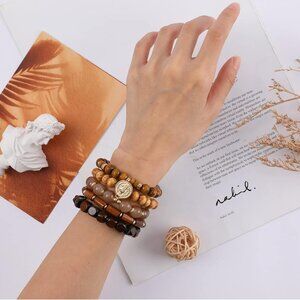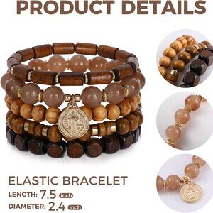 Features: Includes 5pcs of stackable beaded bracelets—4 in rich shades of brown wood and 1 elegant natural stone bracelet with a gold religious pendant. The mix of wooden and stone beads creates a versatile, stylish vibe perfect for layering or wearing alone.