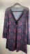 Vibrant bohemian purple and blues, black colorful blouse with beaded deep V-neck. Features a colorful circular pattern.
