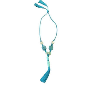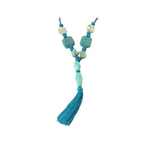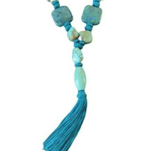 Features a mix of large beads, turquoise silk cord, knots and tassels