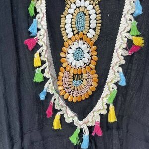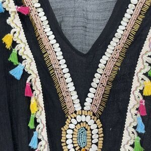 Bohemian Beaded Blouse Black V Neck Dolman Sleeve One Size Beach Tunic LOF NEW