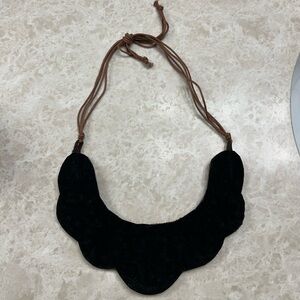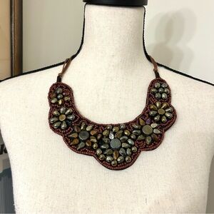 The intricate multi colored beaded design features a scalloped pattern, creating a great statement piece. Brown/maroon base. Fabric tie.