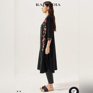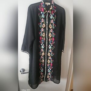 This stylish cardigan features intricate red embroidery along the front, adding a bohemian flair to its classic black design. With three-quarter sleeves and a knee-length cut, it offers a comfortable and chic look for any casual occasion.
