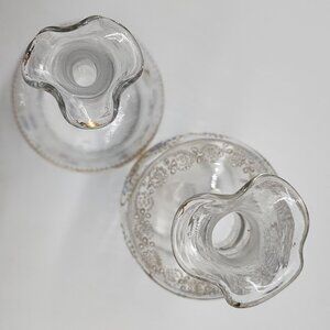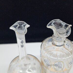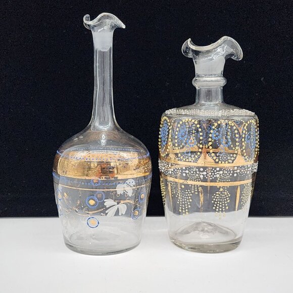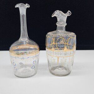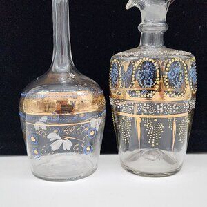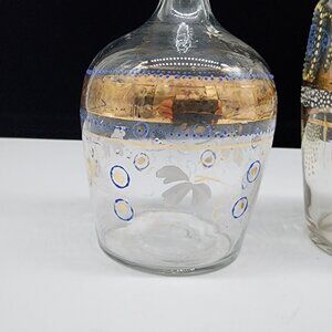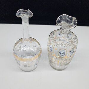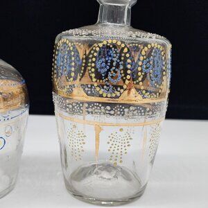 Bohemian Blown Glass Decanters Hand Painted Blue Enamel Gold Paint 7.5"