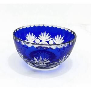 This Bohemian Blue Cut to Clear Crystal Bowl from the Czech Republic features a stunning cross hatch and leaves design, making it a unique and decorative piece for any occasion. Handmade by Bohemia Crystal, this vintage bowl showcases a contemporary style with a glossy finish and floral pattern. Measuring 6 inches in diameter and 3.5 inches in height, this original piece is crafted with care and attention to detail, adding a touch of elegance to your home decor. It has a scalloped edge. It is in excellent, vintage condition with no chips. It does have felt bumpers attached on the bottom. It dates to the late 20th century. It weighs 1.6 lbs. I have two of these available in the same pattern. The price is for one bowl.