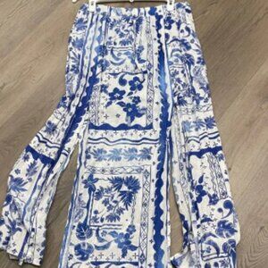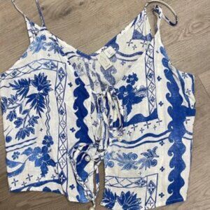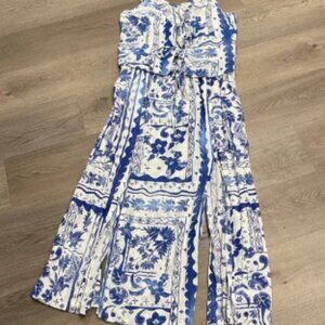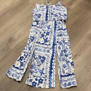 Charming bohemian 2 piece dress with blue and white floral patterns. Features a flowy design with pearls at the end of the ties. Perfect for a cruise, at the seaside, or wherever you take it…
