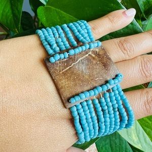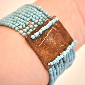 The band is an elastic material with beads so it stretches to fit different wrist sizes. The wooden face is a little scratched but it adds to the tribal/bohemian look.