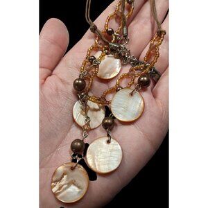 Elevate your style with this bohemian necklace, featuring brown glass beads and shell fringe accents, perfect for casual or dressy outfits.