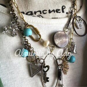 Unique bohemian necklace featuring turquoise beads and various charms. Perfect for adding a touch of color and style.