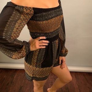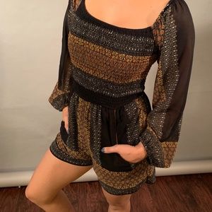 This brand new cute sophisticated boho romper comes with sheer sleeves and a Chloe-like print with pockets. Light, fitted and stretchy. Extremely comfortable and the color is beautiful in person. Perfect for the weekend or nights out.