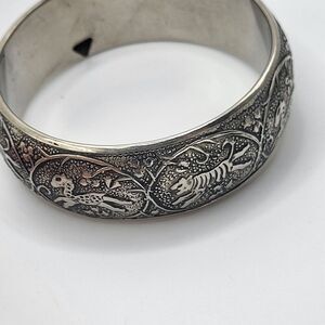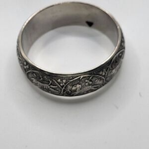 Materials: stainless steel Length: 1 in wide Clasp: slide on Signed? no Excellent vintage condition