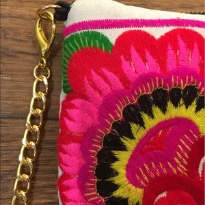 Thailand Hmong hill tribe fabric and modified in California with quality lining and gold tone hardware. Floral embroidery. Top zip closure. Fully lined. Detachable shoulder strap. Gold chain. 21" strap drop. Can be worn as a clutch or shoulder bag!